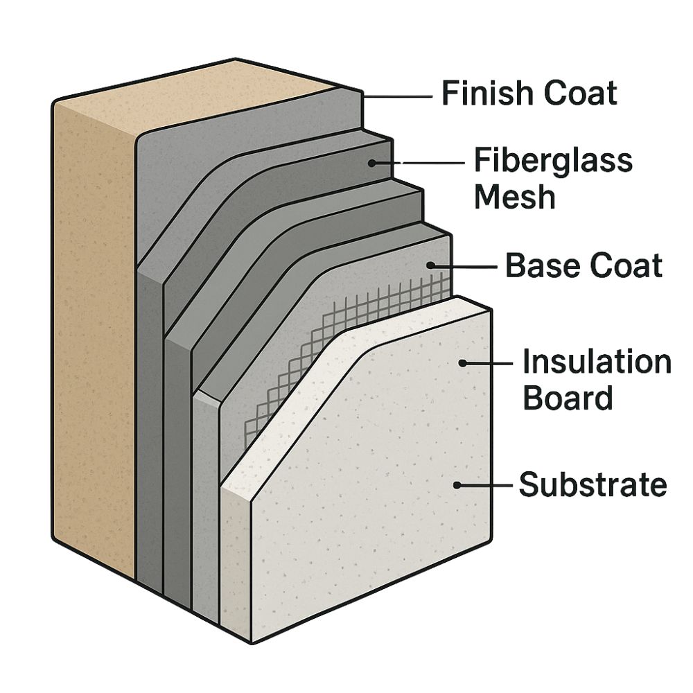 EIFS (Exterior Insulation Finish System) stucco is a lightweight synthetic wall cladding composed of: